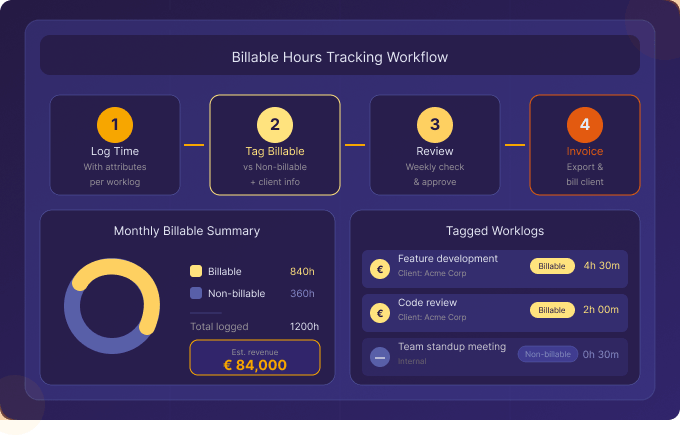 - Define categories: Agree on what counts as billable (client feature work) vs. non-billable (internal meetings, training, tech debt)