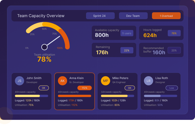 At a glance, team leads can see who is over capacity, who has bandwidth, and whether the team as a whole is on track.