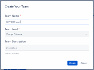 Please note, that if the “Create” button is disabled, you might not have Team Managers permissions in the app configuration. Please contact your administrator. See more: Permissions