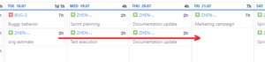 The data is shown as a table, where the column is the day of the week. Worklogs are displayed one below another. Each worklog has the same size, no matter how long you worked and booked. Near the dates, you can find the sum of logged time per day.