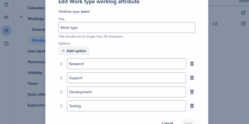 In addition, select list attributes can now be used in the Worklog analysis view. This allows you to group and compare worklogs by the chosen drop-down options, making analysis easier and more structured.