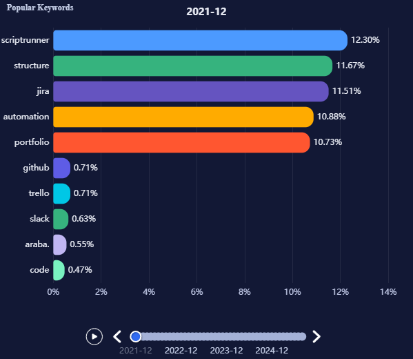The Atlassian Marketplace user base has grown and evolved significantly in the past few years, and their search habits reflect that. Back in December 2021 (the earliest data point we were able to collect), just a handful of queries dominated the charts. In fact, the top five search keywords in Dec 2021 – “scriptrunner”, “structure”, “jira”, “automation”, and “portfolio” – together made up well over 50% of all searches. The #1 term, ScriptRunner, alone accounted for about 12% of searches. It’s clear that a few big-name add-ons (and some missing features) were on everyone’s mind.